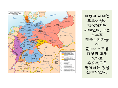 시대 정신은 마치 하나의 시계 추처럼 좌우를 오간다. (질문: 한국의 지금 여기의 시대정신, 정치적 지형도는 어떠한가?) 19세기 말 프로이센에서는 극우파들이 득세하고 있었다. 메링은 이들의 자기 중심적 국수주의 내지는 맹목적 애국주의를 비판하고 싶었다. 사람들이 클라이스트를 "애국적 지조를 지닌 프로이센 작가"라고 칭송했을 때, 메링은 이를 비판하면서, 클라이스트를 "미쳐버린 낭만주의자"라고 못을 박았다. 이로 인하여 독일 전역에서는 클라이스트가 과거지향적 반동 작가라는 낙인이 찍히게 되었다.