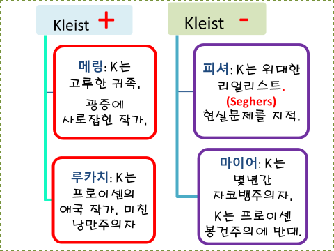 클라이스트 문학에 대한 호불호는 극명하게 나누어진다. 혹자는 클라이스트에게서 실패한 계몽주의 내지는 퇴폐적 반동적 낭만주의의 잔재를 발견하고 있으며, 혹자는 클라이스트가 마치 지진 내지는 파국과 같은 주어진 현실을 그대로 인지하는 지진계처럼 반응하였다고 한다. 누구의 말이 옳은가? 약간의 의견대립은 얼마든지 있을 수 있다. 그렇지만 한 사람은 한 가지 사항을 주장하고, 다른 한 사람은 이와 정반대되는 사항을 주장한다. 한 작가의 작품을 이런 식의 극단적으로 다르게 평가해도 우리는 그것을 정당하다고 말할 수 있는가? 약간의 편차는 용인할 수 있을지언정, 극과극의 반대 현상을 모조리 옳다고 말할 수는 없다.