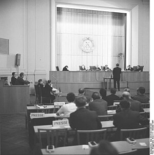 동독의 재판정. 판사의 자리가 높은 곳에 위치하고 있다. 이는 무엇을 의미하는가?