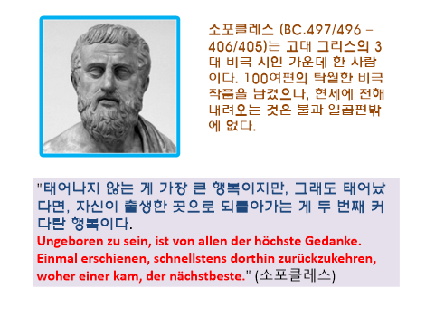 소포클레스의 문장은 소설 '히페리온'의 모토로 사용되고 있다. 세상에 태어난다는 것은 당신에게 어떠한 의미가 있는가? 이 세상은 우리에게는 어쩌면 지옥인지 모른다. 추위와 굶주림 그리고 부자유. 우리는 태어나는 순간부터 팔과 다리를 놀리지 않으면 살아남을 수 없다. "이마에 땀을 흘리지 않으면, 빵을 먹어서는 아니 된다."는 구절을 생각해 보라, 가난과 궁핍함, 경쟁 그리고 이로 인한 미움 등은 이 세상이라는 복마전(伏魔殿)에서 우리가 감내해야 할 과정인지 모른다.