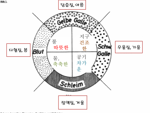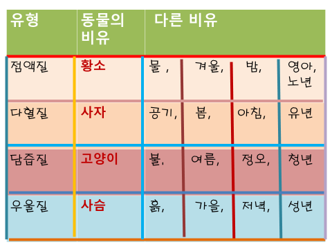 다혈질의 인간 (소양인)이 봄 (물, 水)에 비유될 수 있다면, 담즙질의 인간 (태양인)은 여름 (불, 火)에, 우울질의 인간 (소음인)은 가을 (바람, 공기)에, 점액질의 인간(태음인)은 겨울 (흙, 土) 에 비유될 수 있다.
