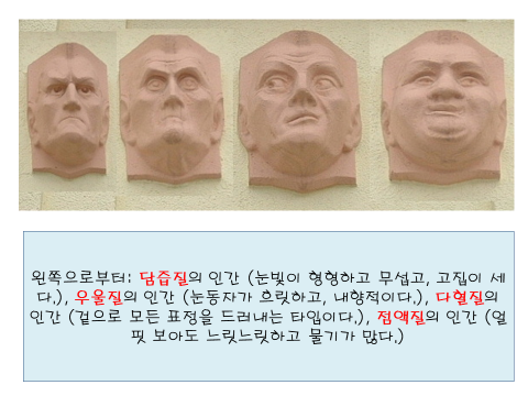 1. 점액질: 느리게 반응한다. 살찐 사람이 많다. 2. 다혈질: 화를 자주 내지만 뒤끝이 없다. 하체가 약하다. 3. 담즙질: 맺고 끊음이 분명하다, 유머가 없다. 4. 우울질: 내면을 감춘다. 참을성이 많다. 몸은 약하지만, 하체는 튼튼하다.
