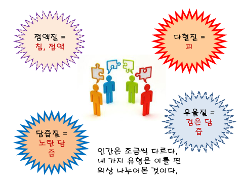인간의 4유형을 비교한 그림이다. 이제마의 사상의학과 비교하면 다음과 같다. 담즙질 -> 태양인 (급하고 독선적이다. 논리적이고 진취적인 성격의 소유자이다.) 다혈질 -> 소양인 (사교적이고, 밝은 성격의 소유자이다. 경솔한 면이 있다.) 점액질 -> 태음인 (게으르고 욕심이 많으며, 영리하다.) 우울질 -> 소음인 (내정적이고, 예민한 성격의 소유자)