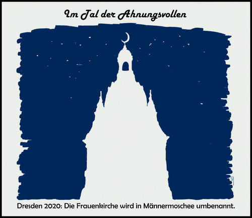 드레스덴의 프라우엔 교회를 풍자한 캐리커져입니다. 프라우엔 교회는 남성들의 회교당으로 거론될 수 있습니다. 사진은 어둠 속의 하얀 교회 아니면 남자, 쩍벌남의 두 다리를 보여주고 있습니다. 화가는 엄청난 비용을 요구하는 건축 사업에 대해 불만을 표시하는 듯 합니다.